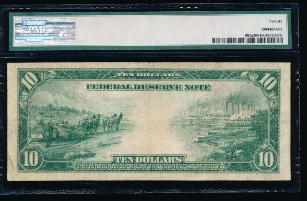 One 1914 $10 Red Seal Kansas City Federal Reserve Note PMG 20.