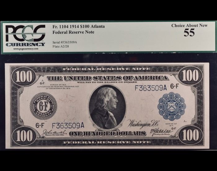 One 1914 $100 Atlanta Federal Reserve Note PCGS 55.