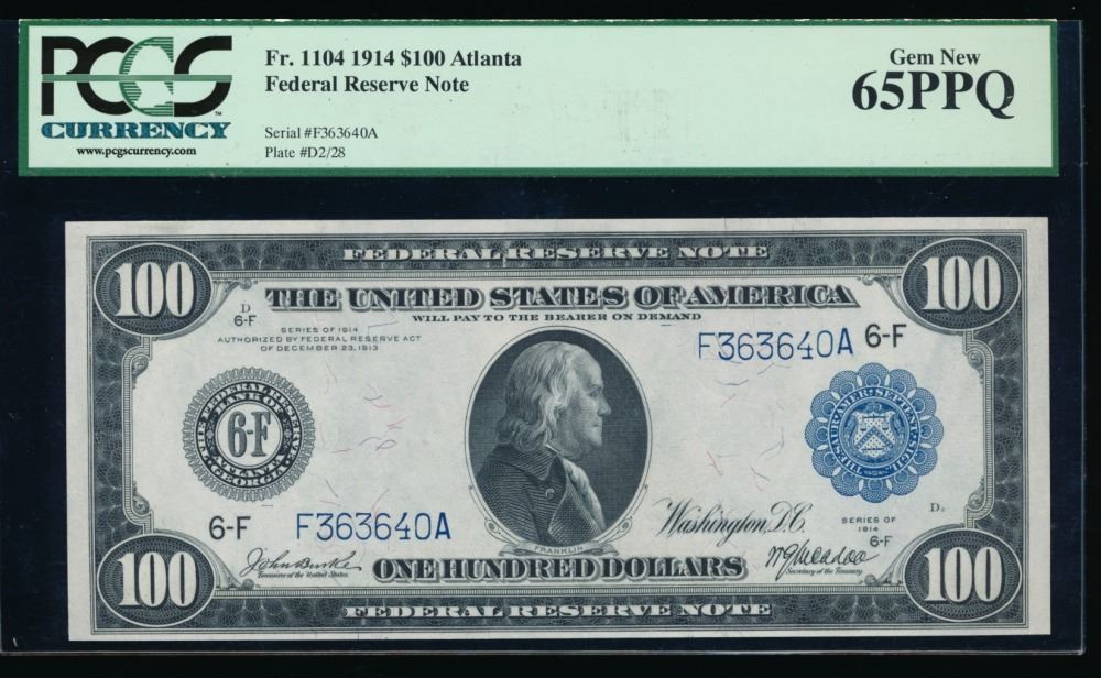 One 1914 $100 Atlanta Federal Reserve Note PCGS 65PPQ.