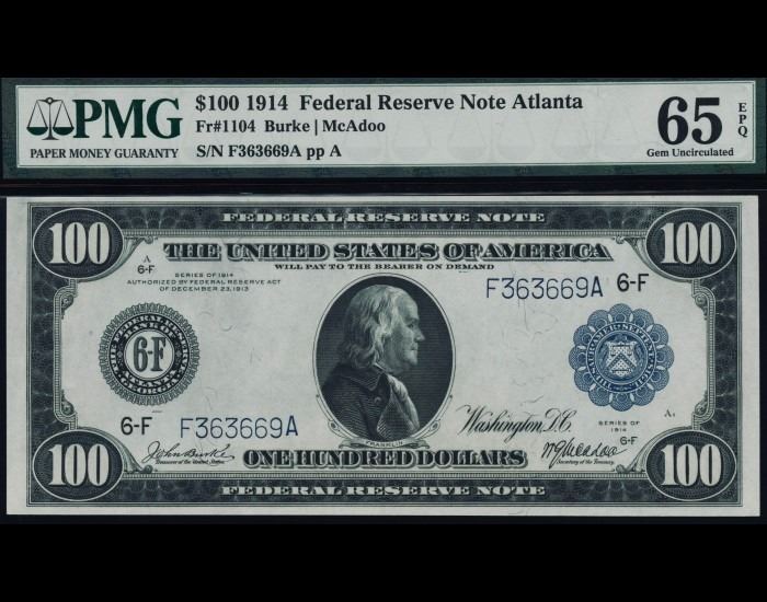 One 1914 $100 Atlanta Federal Reserve Note PMG 65EPQ.