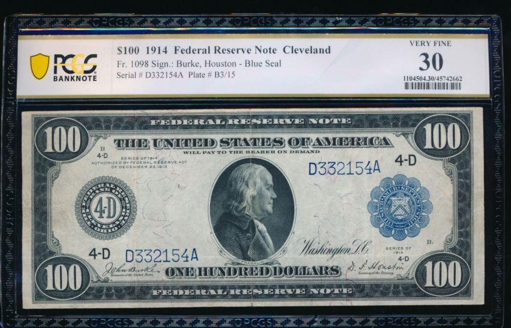 One 1914 $100 Cleveland FRN PCGS 30.