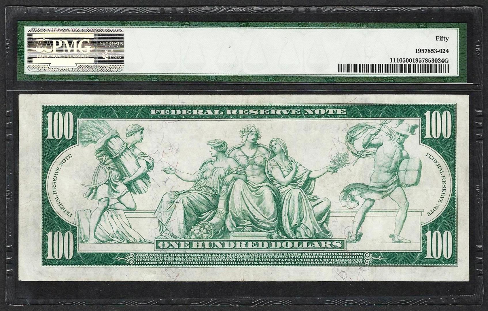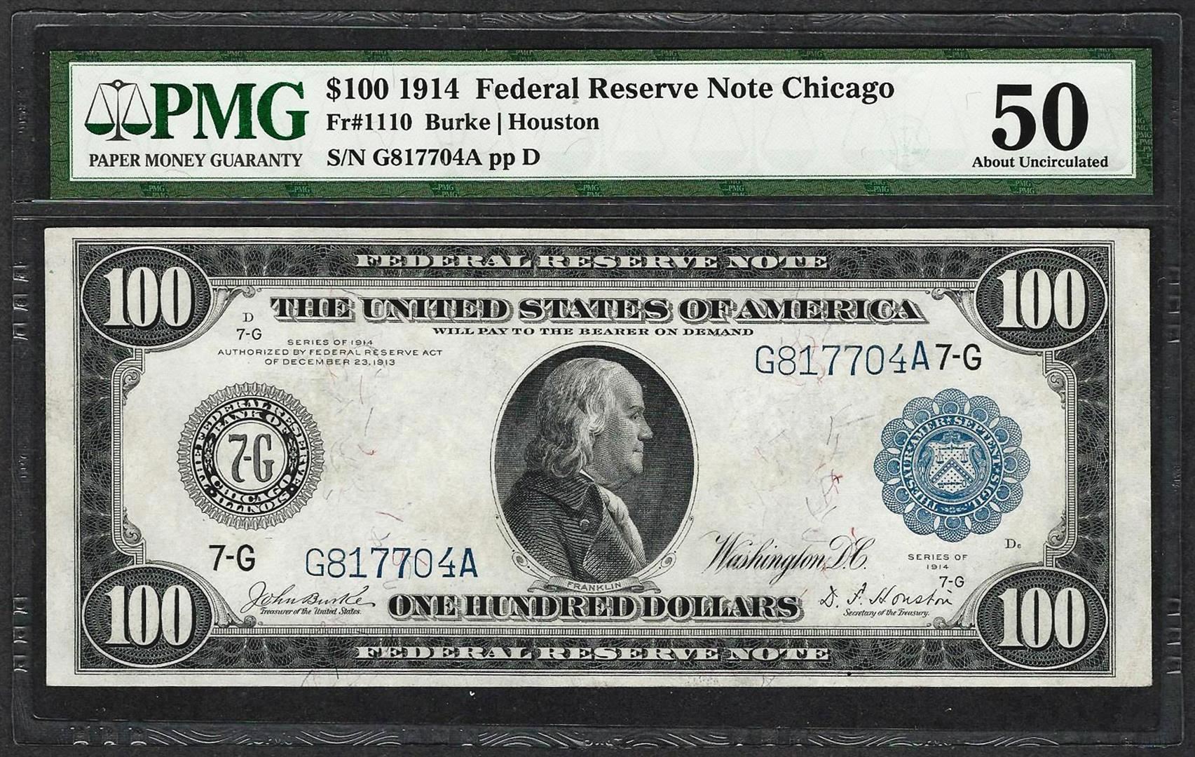 One 1914 $100 Federal Reserve Note Chicago Fr.1110 PMG About Uncirculated 50. PMG Certified.