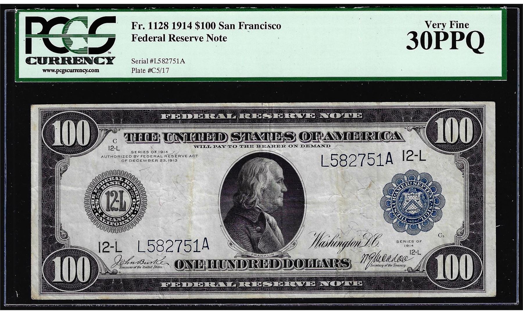 One 1914 $100 Federal Reserve Note San Francisco Fr.1128 PCGS Very Fine 30PPQ. PCGS Graded.