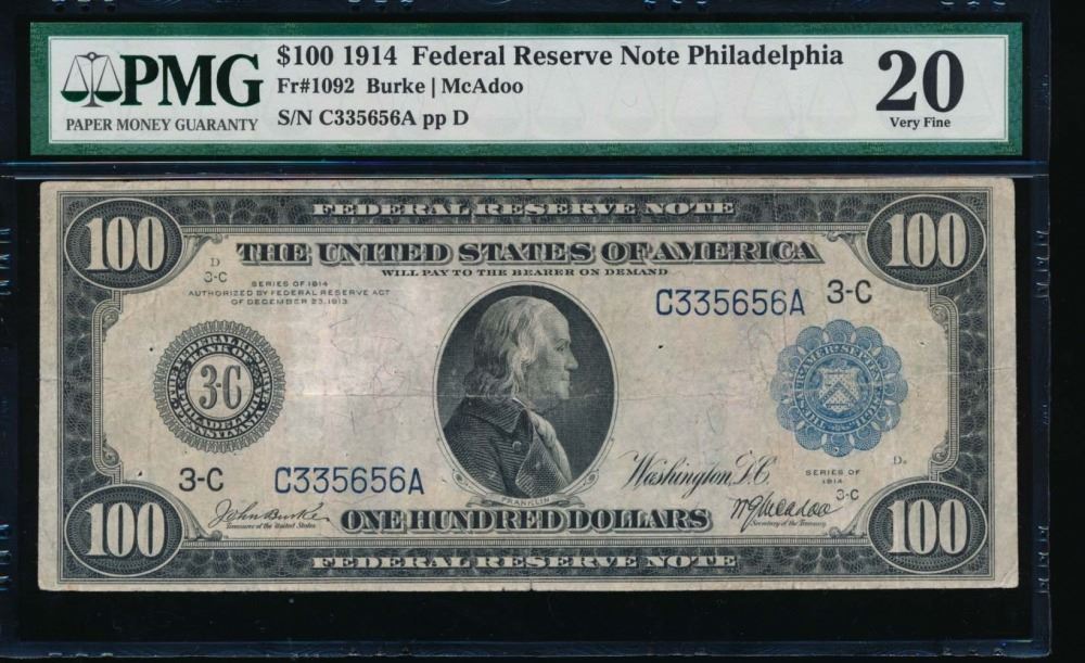 One 1914 $100 Philadelphia Federal Reserve Note PMG 20.