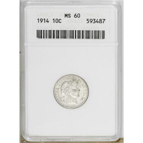 <B>1914 10C MS60 ANACS.</B></I> NGC Census: (1/568). PCGS Population (10/722). Mintage: 17,360,656. Numismedia Wsl. Price for NGC/PCGS coin in MS60: $84. (#4865)<BR><BR><B>Coin Engraver:</B> Charles E. Barber<BR><BR><b>Shipping:</b> Coins & Currency (<a target="_blank" href="http://www.heritageauctions.com/common/shipping.php">view shipping information</a>)