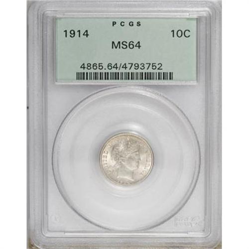 <B>1914 10C MS64 PCGS.</B></I> PCGS Population (264/184). NGC Census: (249/136). Mintage: 17,360,656. Numismedia Wsl. Price for NGC/PCGS coin in MS64: $252. (#4865)<BR><BR><B>Coin Engraver:</B> Charles E. Barber<BR><BR><b>Shipping:</b> Coins & Currency (<a target="_blank" href="http://www.heritageauctions.com/common/shipping.php">view shipping information</a>)