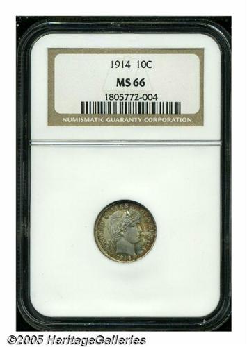 <B>1914<10C> MS66 NGC.</B></I> Fully struck, the surfaces display light gray toning overall with deeper golden-russet coloration around the margins. An unquestionably original example of this late-date Barber dime.