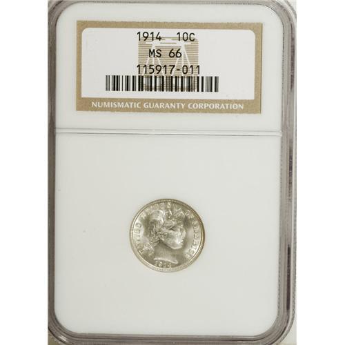 <B>1914 10C MS66 NGC.</B></I> Well struck, lustrous and untoned, with bright snow-white surfaces that are unimpaired by any distracting abrasions. A high mintage issue that remains scarce at the Premium Gem level of preservation. Census: 29 in 66, 1 finer (4/07).<BR><BR><b>Shipping:</b> Coins & Currency (<a target="_blank" href="http://www.heritageauctions.com/common/shipping.php">view shipping information</a>)