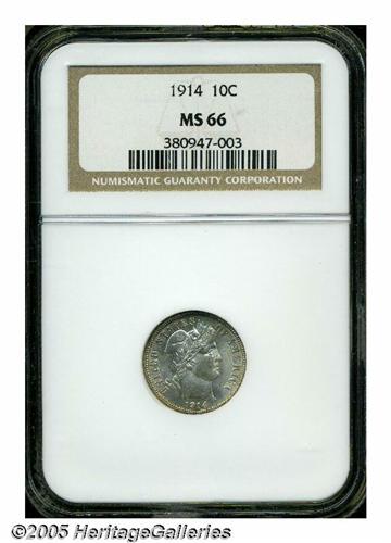 <B>1914<10C> MS66 NGC.</B></I> Wisps of tan patina enrich the margins of this lustrous and nicely struck premium Gem. Lovingly preserved, and worthy of the finest quality type set or specialized Barber collection. Population: 24 in 66, 1 finer (6/05).