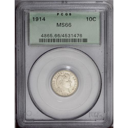 <B>1914<10C> MS66 PCGS.</B></I> Essentially untoned surfaces yield radiant luster and sharply impressed design elements. A couple of unobtrusive marks on Liberty's cheek and neck are mentioned for accuracy. Population: 36 in 66, 5 finer (1/06).