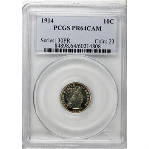 <B>1914 10C PR64 Cameo PCGS.</B></I> A gleaming Choice specimen with distinct contrast and undeniable visual appeal. Watery mirrors with faint hairlines show delicate green-gold and amber patina. Population: 4 in 64 Cameo, 11 finer (1/08).<BR><BR><b>Shipping:</b> Coins & Currency (<a target="_blank" href="http://www.heritageauctions.com/common/shipping.php">view shipping information</a>)<BR><BR><B>Important not