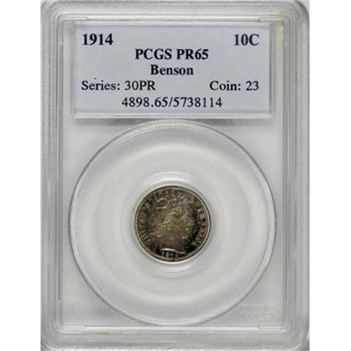 <B>1914 10C PR65 PCGS.</B></I> Ex: Benson. With just 425 pieces struck, the 1914 has the lowest mintage of any generally available Barber dime proof. This delightful Gem exemplar is pleasingly preserved with areas of aqua and violet patina over a delicate golden base. Population: 20 in 65, 17 finer (10/07).<BR><BR><B>Coin Engraver:</B> Charles E. Barber<BR><BR><b>Shipping:</b> Coins & Currency (<a target="_blank" href="http://www.heritageauctions.com/common/shipping.php">view shipping information</a>)