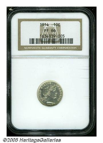<B>1914<10C> PR66 NGC.</B></I> Gorgeous proof example with flashy fields and lightly frosted devices that provide slight contrast. Virtually flawless, and highly attractive Premium Gem. Population: 18 in 66, 9 finer (6/05).