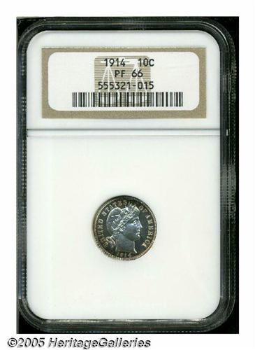 <B>1914<10C> PR66 NGC.</B></I> Lovely Premium Gem example with deep violet and indigo peripheries. The surfaces are quite flashy, and the strike is quite good. Population: 18 in 66, 9 finer (6/05).