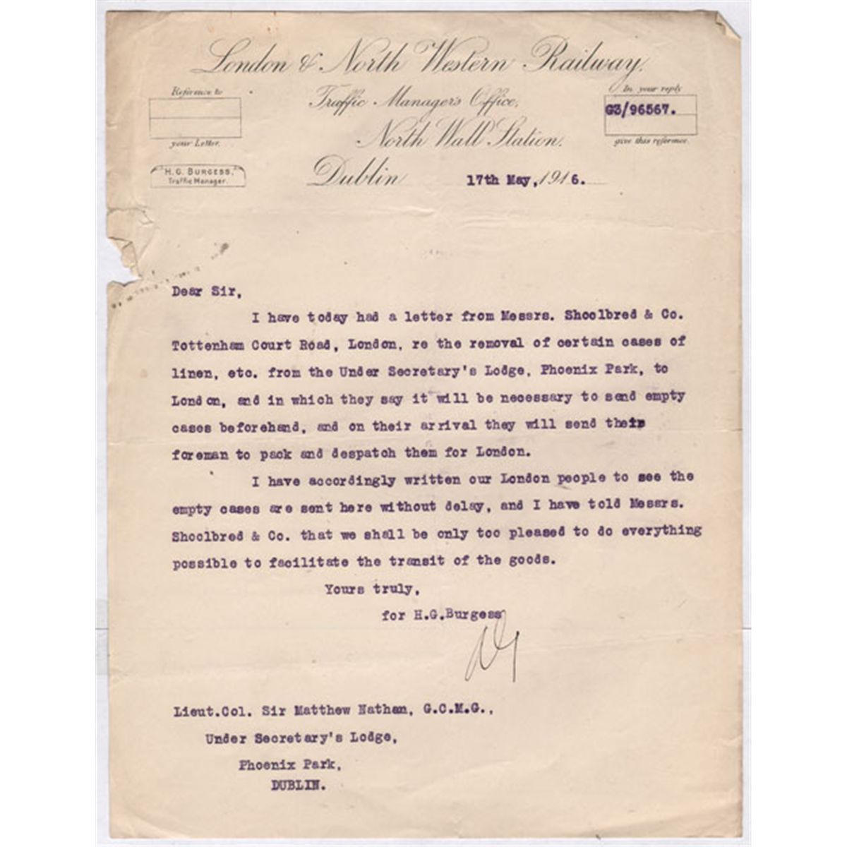 A collection of documents from the personal papers of Lieutenant-Colonel Sir Matthew Nathan, GCMG relating to his time as Under-Secretary for Ireland from 1914 to 1916. Includes minutes from the Defence of the Realm Regulations Amendent Committee, formed after the 1916 Rebellion. Minutes from the meeting of the informal conference on Irish transfer orders-in-council, with John Redmond and John Dillon in attendance. Typescript copy of a letter sent by Lloyd George to Sir Horace Plunkett relating the Irish political situation. Report of the committee of alleged German outrages during the First World War. Various other political letters and receipts including some relating to removal of Nathan's belongings from the Under Secretary's Lodge in the Phoenix Park after his resignation due to the Easter Rising.