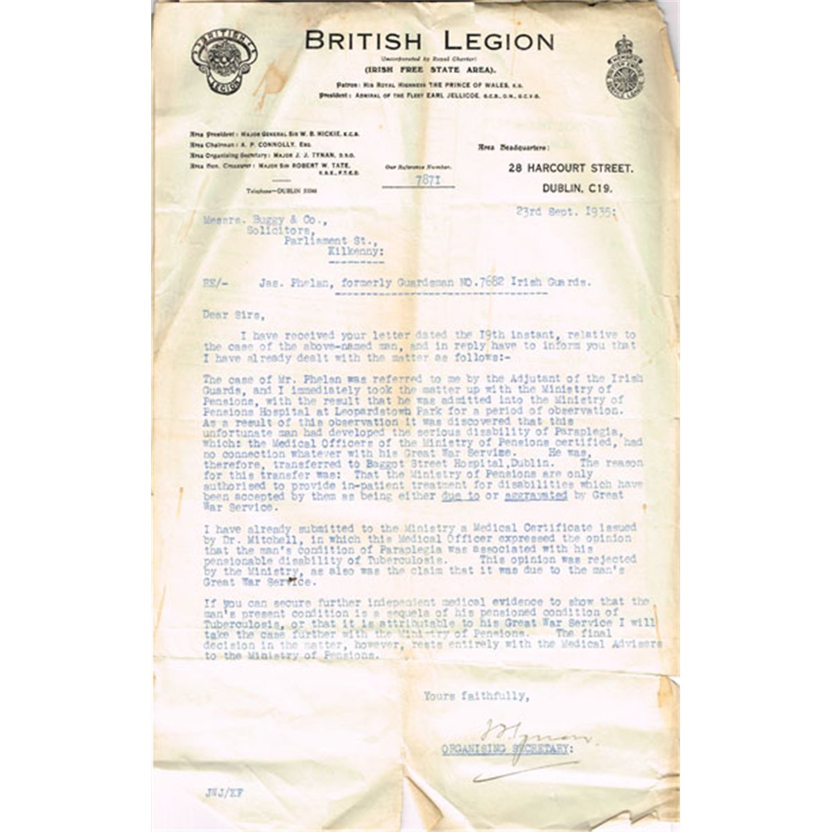 Letters, legal documents and Army discharge documents sent in relation to 7662 Private James Phelan Irish Guards and the British Ministry of Pensions refusal to accept that his condition was due, or in any way related to the impact of his service with the Irish Guards during the First World War. Also with other documents relating to the Phelan family.