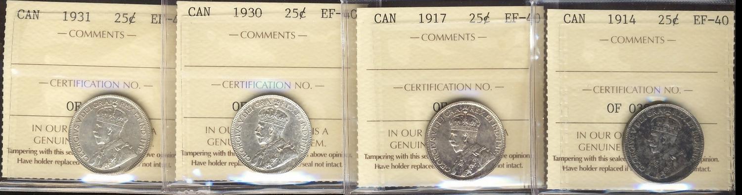 1914, 1917, 1930, 1931 25¢ all ICCS EF40, Lot of 4 coins,