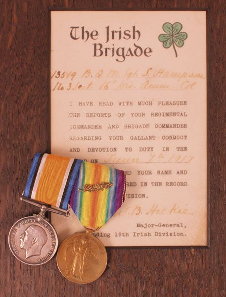 British War Medal and Victory Medal, with mentioned in despatches oak leaf, officially named to 13519 B. Q. M. Sjt. S. Hampson R.A. Also with 16th (Irish) Division commendation certificate issued by Major General W. B. Hickie and awarded to 13519 B. Q. M. Sjt. S. Hampson No 3 Sect. 16th Div. Amm. Col. for "gallant conduct and devotion to duty in the field on June 7th 1917" and mentioned in despatches certificate from Sir Douglas Haig awarded to B.Q.M.S.S. Hampson and issued by Winston Churchill. The latter two framed. (4 items)Sydney Hampson, a painter, enlisted in the Royal Artillery in 1914 and quickly rose through the ranks. He served on the Western Front from 1916, he was twice mentioned in dispatches. One of these mentions, as confirmed by the parchment included in this lot, was for the famous Battle of Messines in which the 16th (Irish) and 36th (Ulster) Divisions famously took a major part together.