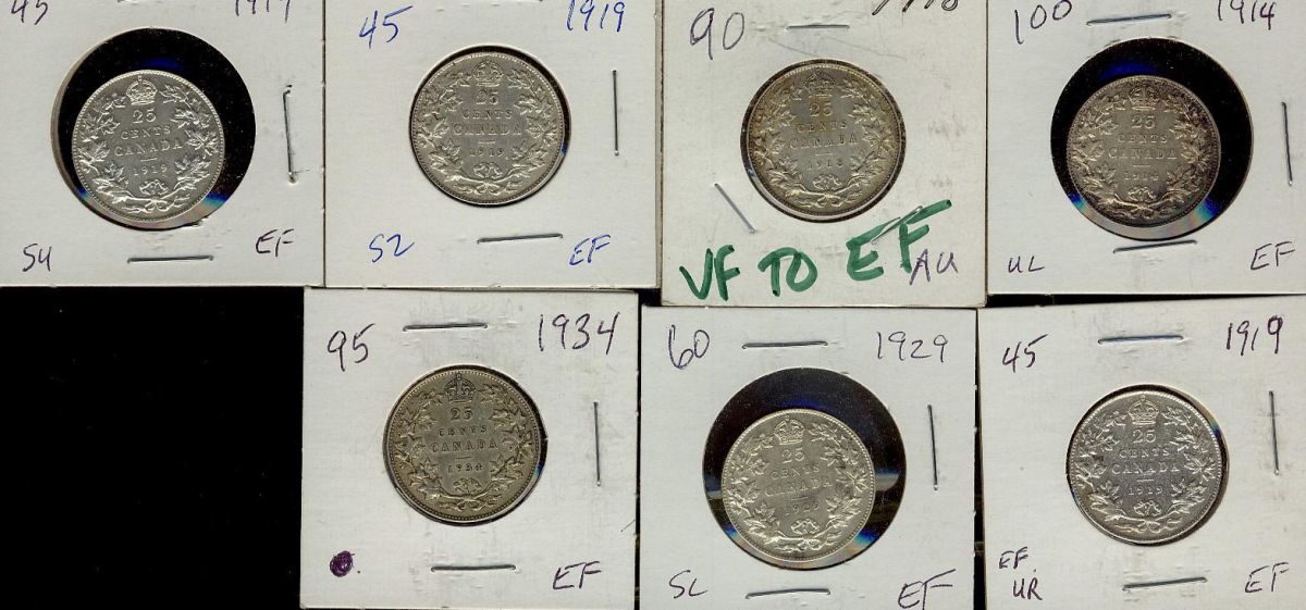 1914, 1918, 1919 (3), 1929 & 1934 25¢ . Lot of 7 coins VF to EF. Should be viewed.