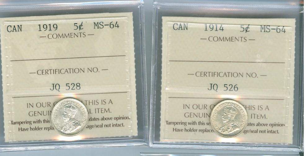 1914 & 1919 5¢. Lot of two coins both ICCS MS64. Brilliant examples.