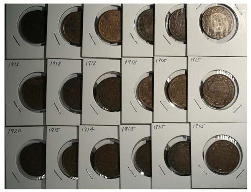 18 piece mixed lot of Geo.V large cents. Mostly all Fine and better with only 3 coins in VG. As follows: 2x1914; 6x1915; 1x1916; 4x1917; 4x1918 and 1x1920 (no return).