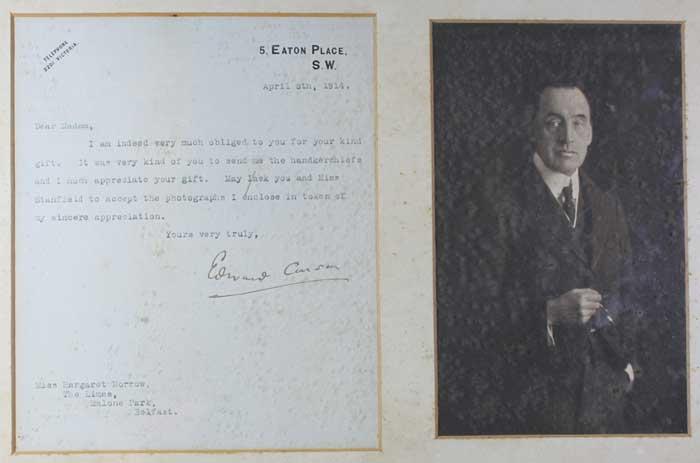 A photograph of Sir Edward Carson and letter signed and dated two weeks before the Larne gun running, in a glazed frame, thanking Miss Margaret Morrow of Belfast for her gift. A memorial ribbon worn by mourners at Lord Carson's funeral on 26 October 1935. A printed caricature of Carson framed by Chichester Galleries Belfast in 1983 with a note on the rear stating "Donated by Alderman Peter D. Robinson MP MLA". (3 items)