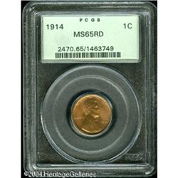 1914 1C MS65 Red PCGS. Sharply struck with matte-l <B>1914 1C MS65 Red PCGS.</B></I> Sharply struck with matte-like surfaces, minor scattered carbon, and the absence of any distracting surface marks. A very appealing Gem. Population: 97 in 65, 36 finer (11/04).<BR><I>From The Dennis Dewart Collection.</B></I> <BR><BR><B>Important notice:</B> Heritage usually auctions material at the rate of 200-250 lots per hour. On some occasions eBay Live bid software or the Internet may not be able to keep up with the pace of the auction. We recommend placing a realistic absentee bid now as insurance to avoid disappointment. Occasionally the auctioneer may eliminate or reject an eBay Live bid, and the auctioneer may also reopen a lot after the close of the eBay live bidding (usually because we missed an audience bid), and may reject your bid even if it shows you as the winning bidder. By bidding via eBay Live, you agree that Heritage may award the lot to another bidder at its sole discretion under the circumstances described above or any other reasonable circumstances. Since eBay bids are not shown to us until we open the lot on the floor, we treat those bids just like floor bids. In most cases the floor responds before the eBay bid is presented to us, due to Internet lag time, so for consistency we have made it a policy that floor bids are always considered first over tie eBay live bids. Also please note that all Heritage lots purchased through eBay Live carry a 20% Buyer's Premium. Please make sure you read the Terms and Conditions before you bid. This lot is being auctioned in conjunction with a live floor auction by Heritage Galleries & Auctioneers. All final auction and invoice information will be supplied by Heritage Galleries & Auctioneers, and all other information should be considered preliminary. Lot:5143