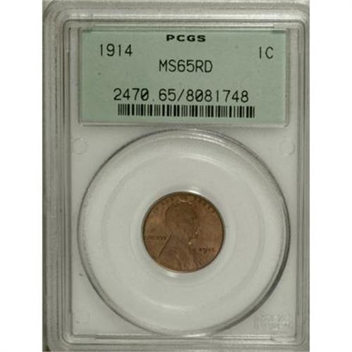 <B>1914 1C MS65 Red PCGS.</B></I> This crisply struck and satiny orange and olive Gem is virtually void of marks or carbon. A slender, vertical retained lamination approaches Lincoln's chin. Housed in an old green label holder.<BR><I>Ex: Kyle Patrick Collection (Heritage, 6/04), lot 5272, which realized $690.</B></I><BR><BR><B>Coin Engraver:</B> Victor D. Brenner<BR><BR><b>Shipping:</b> Coins & Currency (<a target="_blank" href="http://www.heritageauctions.com/common/shipping.php">view shipping information</a>)