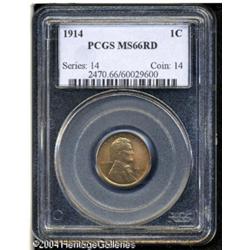 1914 1C MS66 Red PCGS. A stunningly original coin <B>1914 1C MS66 Red PCGS.</B></I> A stunningly original coin that looks like it could have been struck yesterday. The color is a lovely light shade of red, and there are only a few minimal abrasions that serve to limit the grade. This is a must-see coin for anyone interested in the Lincoln series. Population: 33 in 66, 3 finer (10/04). <BR><BR><B>Important notice:</B> Heritage usually auctions material at the rate of 200-250 lots per hour. On some occasions eBay Live bid software or the Internet may not be able to keep up with the pace of the auction. We recommend placing a realistic absentee bid now as insurance to avoid disappointment. Occasionally the auctioneer may eliminate or reject an eBay Live bid, and the auctioneer may also reopen a lot after the close of the eBay live bidding (usually because we missed an audience bid), and may reject your bid even if it shows you as the winning bidder. By bidding via eBay Live, you agree that Heritage may award the lot to another bidder at its sole discretion under the circumstances described above or any other reasonable circumstances. Since eBay bids are not shown to us until we open the lot on the floor, we treat those bids just like floor bids. In most cases the floor responds before the eBay bid is presented to us, due to Internet lag time, so for consistency we have made it a policy that floor bids are always considered first over tie eBay live bids. Also please note that all Heritage lots purchased through eBay Live carry a 20% Buyer's Premium. Please make sure you read the Terms and Conditions before you bid. This lot is being auctioned in conjunction with a live floor auction by Heritage Galleries & Auctioneers. All final auction and invoice information will be supplied by Heritage Galleries & Auctioneers, and all other information should be considered preliminary. Lot:5243