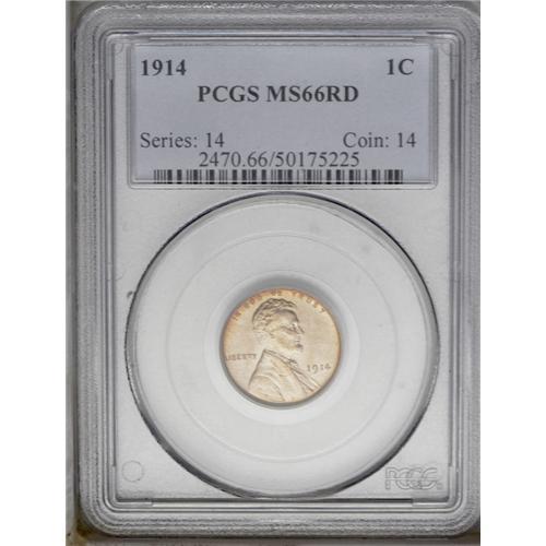 <B>1914<1C> MS66 Red PCGS.</B></I> Lustrous in the fields and rather sharp for this date and mint. The surfaces are quite clean as expected for a Premium Gem grade, with a couple of trace abrasions visible with a magnifier. Mostly bright yellow-red with some crimson accents on the upper reverse rim. Scarce this nice and virtually unobtainable finer. Population: 42 in 66, 3 finer (3/06).<BR><I>From The Kendall Marie #4 All-Time Finest PCGS Registry of Lincoln Cents with Varieties, Circulation Strikes, 1909-1958.</B></I> <BR><BR><B>Important notice:</B> Heritage usually auctions material at the rate of 200-250 lots per hour. On some occasions eBay Live bid software or the Internet may not be able to keep up with the pace of the auction. We recommend placing a realistic absentee bid now as insurance to avoid disappointment. Occasionally the auctioneer may eliminate or reject an eBay Live bid, and the auctioneer may also reopen a lot after the close of the eBay live bidding (usually because we missed an audience bid), and may reject your bid even if it shows you as the winning bidder. By bidding via eBay Live, you agree that Heritage may award the lot to another bidder at its sole discretion under the circumstances described above or any other reasonable circumstances. Since eBay bids are not shown to us until we open the lot on the floor, we treat those bids just like floor bids. In most cases the floor responds before the eBay bid is presented to us, due to Internet lag time, so for consistency we have made it a policy that floor bids are always considered first over tie eBay live bids. Also please note that all Heritage lots purchased through eBay Live carry a 20% Buyer's Premium. Please make sure you read the Terms and Conditions before you bid. This lot is being auctioned in conjunction with a live floor auction by Heritage Galleries & Auctioneers. All final auction and invoice information will be supplied by Heritage Galleries & Auctioneers, and all other information should be considered preliminary. Lot:481 <BR><BR><B>Winning Notification and Billing:</B> After the FINAL session in this auction is complete, Heritage will send e-mail and snail mail invoices. This process normally takes several days. All final auction and invoice information will be supplied by Heritage Galleries & Auctioneers, and all other information should be considered preliminary. <BR><BR>This auction will be conducted on a live auction floor and over the Internet through eBay Live. If you choose to place an absentee bid, please take a moment to <font color='#0000ff'><u><a href='http://pages.ebay.com/liveauctions/help/before/laabsentee.html'>learn how eBay Live absentee bidding works</a></u></font><font color='#000000'>
