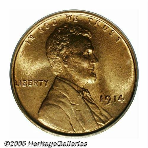 <B>1914<1C> MS67 Red PCGS.</B></I> Simply incredible quality in a 1914 Lincoln Cent. We had an appearance of a similarly certified example in the Heritage September Long Beach Sale last year, that example realized nearly $44,000! One glance at this coin at it becomes immediately obvious that the grade is certainly justified. Both sides are ablaze with shimmering luster and fiery orange-red color. The strike and surface quality are just as impressive with no visible marks, spots, or mentionable post-striking impairments. To date (3/05), only three examples have been certified MS67 at PCGS, NGC has not seen any this high. If you require only the finest quality, this example will easily fit your collection.<BR><I>From The Tom Mershon #2 All-Time PCGS Registry Set of Lincoln Wheat Cents.</B></I>