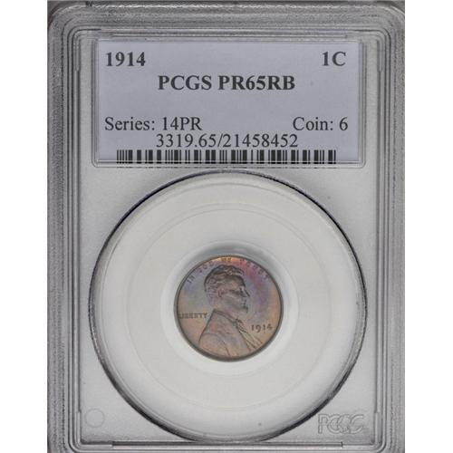 <B>1914<1C> PR65 Red and Brown PCGS.</B></I> Deep crimson and bluish-tan toning dominates the obverse, while the reverse is primarily a copper-gold color. Sharp strike definition characterizes the design elements. A few light flecks and toning spots are visible on the reverse. Population: 38 in 65, 24 finer (4/06).<BR><I>From The Empire Tree Collection.</B></I>