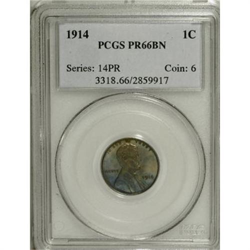 <B>1914 1C PR66 Brown PCGS.</B></I> Fully struck and pristine, with lovely matte proof surfaces that show electric-green and brown toning on the obverse, with satiny brown color across the reverse. Population: 10 in 66 Brown, 0 finer at either service (6/07). <BR><BR><b>Shipping:</b> Coins & Currency (<a target="_blank" href="http://www.heritageauctions.com/common/shipping.php">view shipping information</a>)