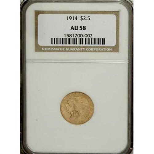 <B>1914 $2 1/2 AU58 NGC.</B></I> NGC Census: (822/3952). PCGS Population (430/1776). Mintage: 240,000. Numismedia Wsl. Price for NGC/PCGS coin in AU58: $250. (#7946)<BR><BR><B>Coin Engraver:</B> Bela Lyon Pratt<BR><BR><b>Shipping:</b> Coins & Currency (<a target="_blank" href="http://www.heritageauctions.com/common/shipping.php">view shipping information</a>)
