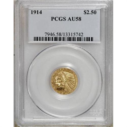 <B>1914 $2 1/2 AU58 PCGS.</B></I> PCGS Population (432/1812). NGC Census: (869/4034). Mintage: 240,000. Numismedia Wsl. Price for NGC/PCGS coin in AU58: $250. (#7946)<BR><BR><B>Coin Engraver:</B> Bela Lyon Pratt<BR><BR><b>Shipping:</b> Coins & Currency (<a target="_blank" href="http://www.heritageauctions.com/common/shipping.php">view shipping information</a>)