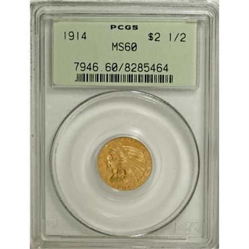 <B>1914 $2 1/2 MS60 PCGS.</B></I> PCGS Population (43/1739). NGC Census: (150/3831). Mintage: 240,000. Numismedia Wsl. Price for NGC/PCGS coin in MS60: $350. (#7946)<BR><BR><B>Coin Engraver:</B> Bela Lyon Pratt<BR><BR><b>Shipping:</b> Coins & Currency (<a target="_blank" href="http://www.heritageauctions.com/common/shipping.php">view shipping information</a>)