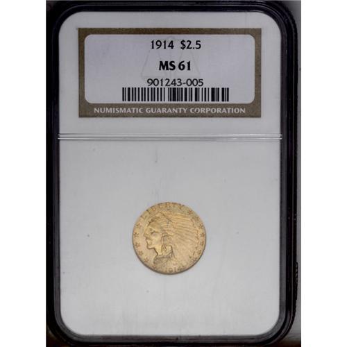 1914 $2 1/2 MS61 NGC. Olive and apricot hues compete f 1914[$2 1/2] MS61 NGC.