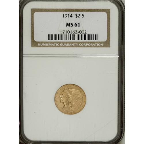<B>1914 $2 1/2 MS61 NGC.</B></I> The satiny surfaces display attractive khaki coloration. A handful of minor marks appear on and near the Indian's face. Some wispy lines are noted in the reverse fields.<BR><BR><b>Shipping:</b> Coins & Currency (<a target="_blank" href="http://www.heritageauctions.com/common/shipping.php">view shipping information</a>)