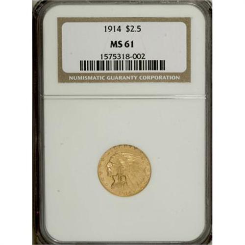 <B>1914 $2 1/2 MS61 NGC.</B></I> A luminous caramel-gold representative with surprisingly few marks. The eagle's plumage is well struck. Only the 1911-D has a lower mintage.<BR><BR><b>Shipping:</b> Coins & Currency (<a target="_blank" href="http://www.heritageauctions.com/common/shipping.php">view shipping information</a>)