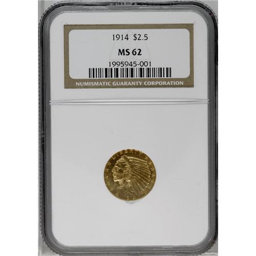 <B>1914<$2 1/2> MS62 NGC.</B></I> A golden-tan example that has a good strike and relatively unabraded fields, but the luster is somewhat subdued. A better date.