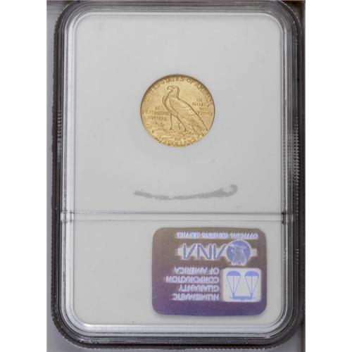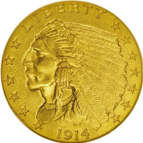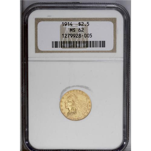 <B>1914<$2 1/2> MS62 NGC.</B></I> As the second scarcest Indian quarter eagle, the 1914 is in demand in all grades. This piece is sharply struck in all areas with numerous small abrasions scattered over each side, which account for the grade. Rich orange-gold coloration.