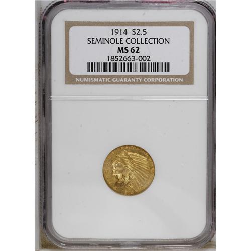 <B>1914<$2 1/2> MS62 NGC.</B></I> Ex: Seminole Collection. Delicate peach accents appear at the Indian's neck and behind the eagle. Solidly struck and satiny, though several significant abrasions appear to the left of the portrait.