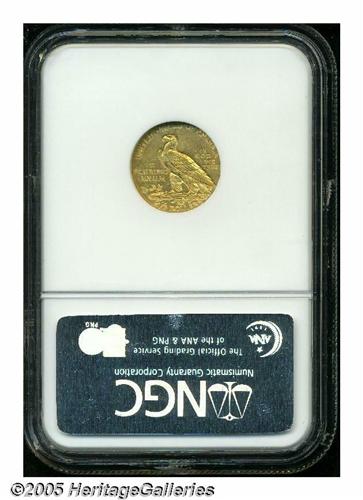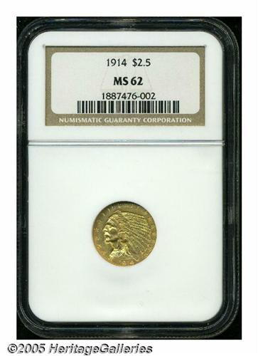 <B>1914<$2 1/2> MS62 NGC.</B></I> Good luster is displayed on each side of this scarce key date example, with one small planchet flaw (as struck) and a few wispy hairlines evident on the upper reverse fields.