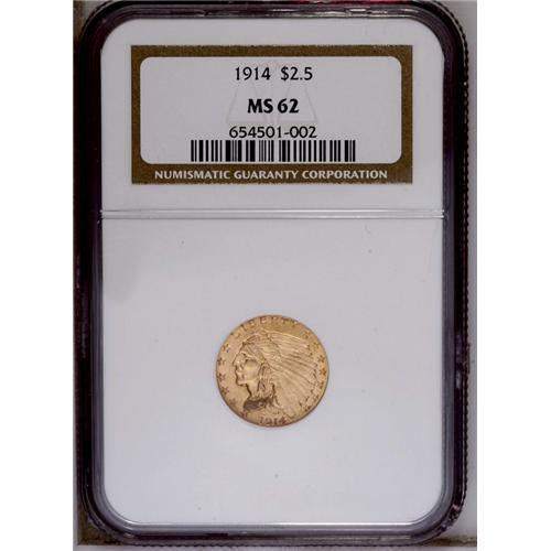 <B>1914<$2 1/2> MS62 NGC.</B></I> Honey-gold surfaces display sharply struck design elements. Contact marks occur on the Indian's face, and some fine hairlines are noted in the fields. <BR><BR><B>Important notice:</B> Heritage usually auctions material at the rate of 200-250 lots per hour. On some occasions eBay Live bid software or the Internet may not be able to keep up with the pace of the auction. We recommend placing a realistic absentee bid now as insurance to avoid disappointment. Occasionally the auctioneer may eliminate or reject an eBay Live bid, and the auctioneer may also reopen a lot after the close of the eBay live bidding (usually because we missed an audience bid), and may reject your bid even if it shows you as the winning bidder. By bidding via eBay Live, you agree that Heritage may award the lot to another bidder at its sole discretion under the circumstances described above or any other reasonable circumstances. Since eBay bids are not shown to us until we open the lot on the floor, we treat those bids just like floor bids. In most cases the floor responds before the eBay bid is presented to us, due to Internet lag time, so for consistency we have made it a policy that floor bids are always considered first over tie eBay live bids. Also please note that all Heritage lots purchased through eBay Live carry a 20% Buyer's Premium. Please make sure you read the Terms and Conditions before you bid. This lot is being auctioned in conjunction with a live floor auction by Heritage Galleries & Auctioneers. All final auction and invoice information will be supplied by Heritage Galleries & Auctioneers, and all other information should be considered preliminary. Lot:2499 <BR><BR><B>Winning Notification and Billing:</B> After the FINAL session in this auction is complete, Heritage will send e-mail and snail mail invoices. This process normally takes several days. All final auction and invoice information will be supplied by Heritage Galleries & Auctioneers, and all other information should be considered preliminary. <BR><BR>This auction will be conducted on a live auction floor and over the Internet through eBay Live. If you choose to place an absentee bid, please take a moment to <font color='#0000ff'><u><a href='http://pages.ebay.com/liveauctions/help/before/laabsentee.html'>learn how eBay Live absentee bidding works</a></u></font><font color='#000000'>