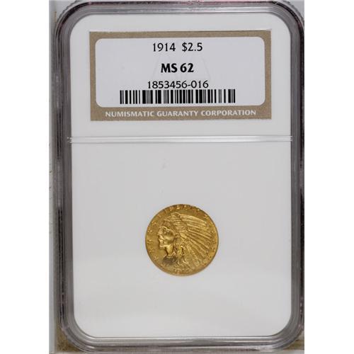 <B>1914 $2 1/2 MS62 NGC.</B></I> Lustrous with lightly abraded yellow-orange surfaces. The centers are well-defined, though slight softness is noted at the lower reverse periphery.<BR><BR><b>Shipping:</b> Coin/Currency (<a target="_blank" href="http://www.heritageauctions.com/common/shipping.php">view shipping information</a>)