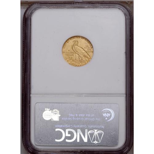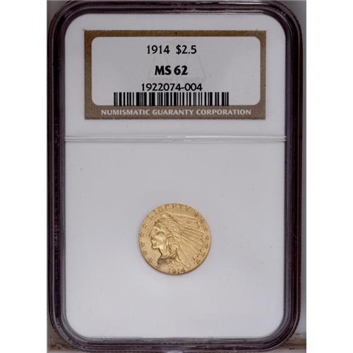 <B>1914<$2 1/2> MS62 NGC.</B></I> Mint-green and peach-gold coloration is seen over both sides of this satiny, boldly struck example. A few wispy nicks and pinscratches determine the MS62 grade level. The 1914 is a significant semi-key date in the Indian quarter eagle series.