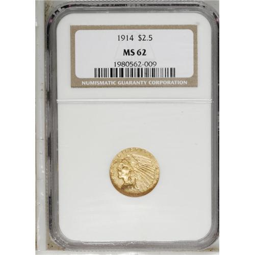 <B>1914<$2 1/2> MS62 NGC.</B></I> Original, well-frosted surfaces are nicely defined over the major design elements, though more noticeably abraded on the reverse. The 1914 is considered to be the second-scarcest issue in the Indian quarter eagle series at the Mint State level.