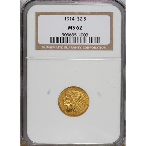 <B>1914 $2 1/2 MS62 NGC.</B></I> The lower-mintage issue of the two struck this year, as Denver struck nearly twice as many quarter eagles as Philadelphia. Boldly impressed with light, scattered abrasions over brassy orange-gold surfaces.<BR><BR><b>Shipping:</b> Coins & Currency (<a target="_blank" href="http://www.heritageauctions.com/common/shipping.php">view shipping information</a>)