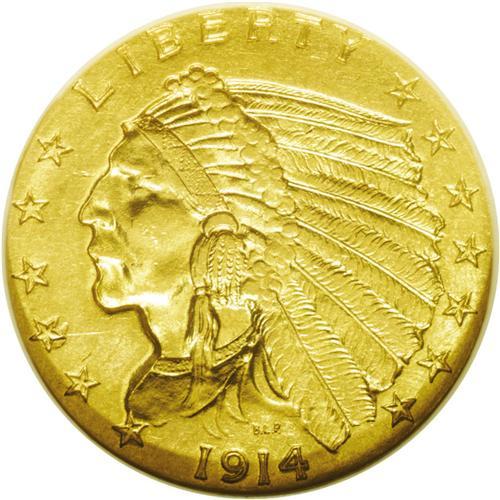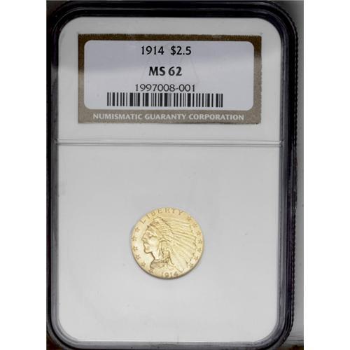 <B>1914<$2 1/2> MS62 NGC.</B></I> This date has the second lowest mintage issue of any Indian quarter with a total production of only 240,000 coins. The surfaces tend towards satiny with brilliant green-gold color. Minor surface marks are present on both sides, consistent with the grade.