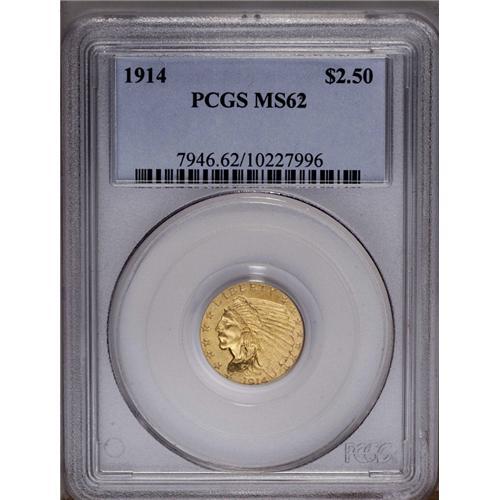 <B>1914<$2 1/2> MS62 PCGS.</B></I> A bright, satiny example of this scarcer, low mintage issue. Well, but not fully struck, the surfaces show a number of small, but individually insignificant abrasions on each side.